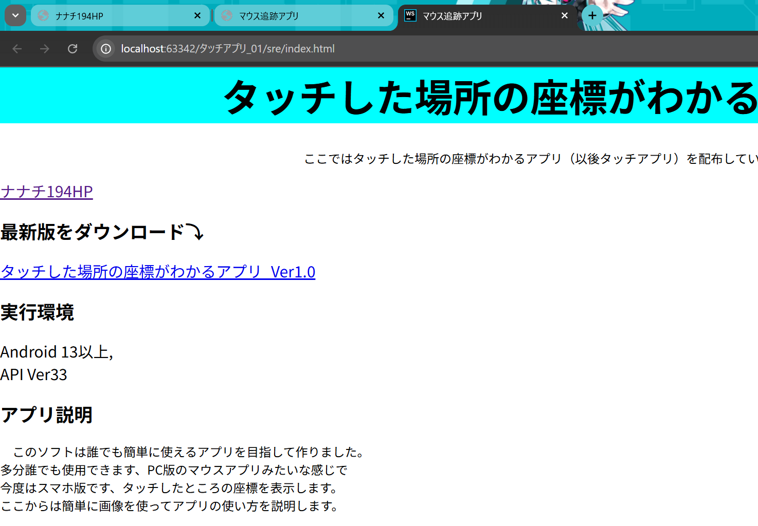 ここではタッチした場所の座標がわかるアプリ(以後タッチアプリ)を配布しています。