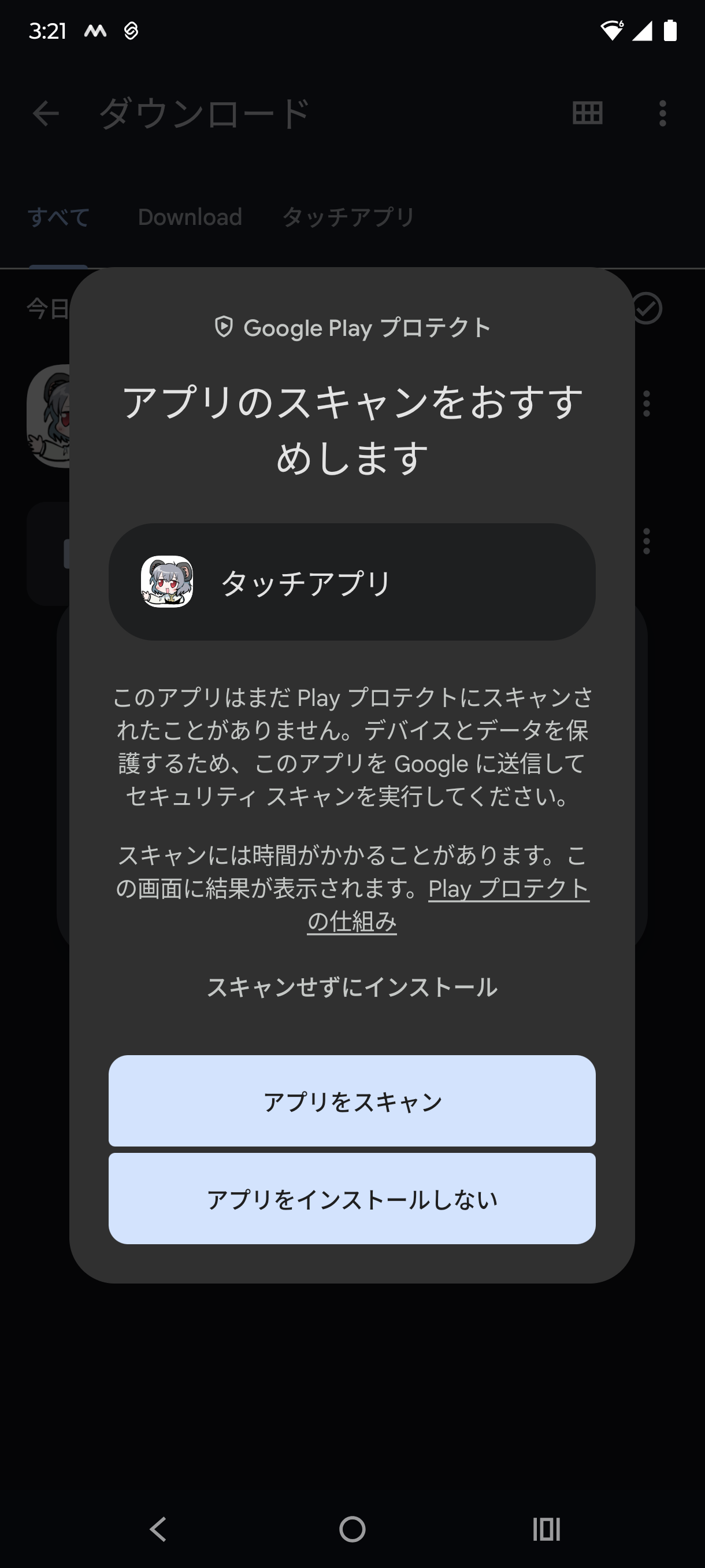 アプリのスキャンとか書いてますが、実際ウイルスなんてものは入ってないので、 多分スキャンしても何も起きずにインストールできます、がスキャンせずにインストール をしたほうか確実で短縮です。